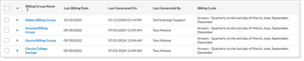 For example, the billing cycle is set to Arrears - Quarterly on the last day of March, June, September, December. Only billing groups with this billing cycle set are displayed.