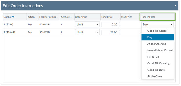 In Tamarac Trading, when you send trade orders to FIX Flyer for execution, you can set Time in Force as an Order Instruction for one or more trade orders.
