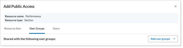 A User Group refers to a collection of users that can be centrally managed. User Groups are used to control access to reports, sections, and modules by assigning permissions to the group instead of individual users. When you grant access to a User Group, all members of that group can view the selected resource.
