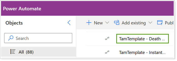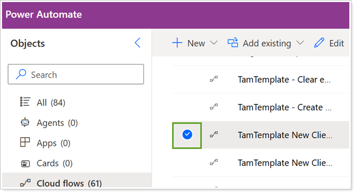 If you don't see your custom flow or flow template in the Tamarac Power Automate Flows Custom Solution, you must add it.
