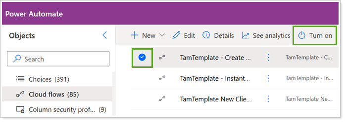 To turn on a Power Automate Flow: