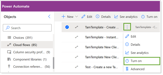 From the Tamarac Power Automate Flows Custom Solution list, select the desired flow.
