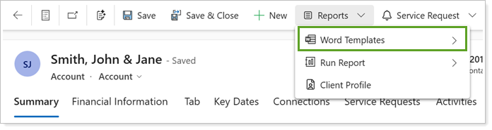You can access Word Templates from the command bar of the corresponding record type under Reports and Word Templates: