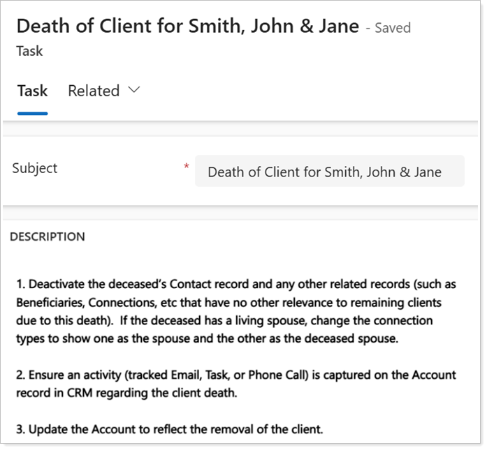 If enabled, when your team updates the Deceased Date for a Contact, the Flow will trigger a Task with the recommended steps to take in both Tamarac CRM and Reporting.
