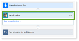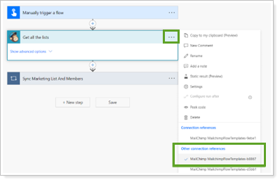 In Get all the lists, select the menu and choose the Mailchimp connection reference created previously.