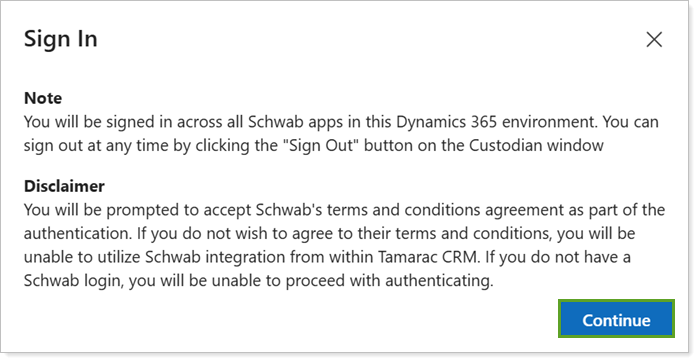 If you aren’t already authenticated in Schwab, you must enter your credentials. Review the Note and Disclaimer, then select Continue.
