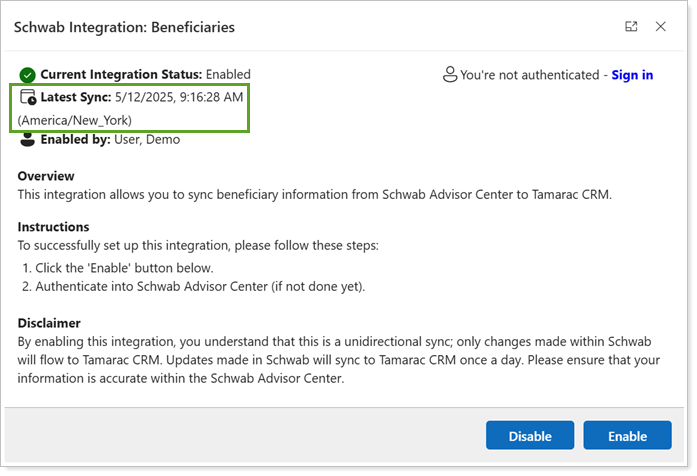 If you disable the Schwab Beneficiaries integration, any beneficiary data that syncs before disabling the feature will remain accessible under Custodian Beneficiaries on financial account records. Once the integration is disabled, no updates will sync from Schwab Advisor Center to these existing beneficiaries in Tamarac CRM.