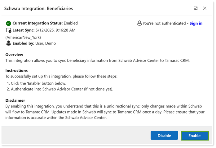 In Schwab Integration: Beneficiaries, select Enable.