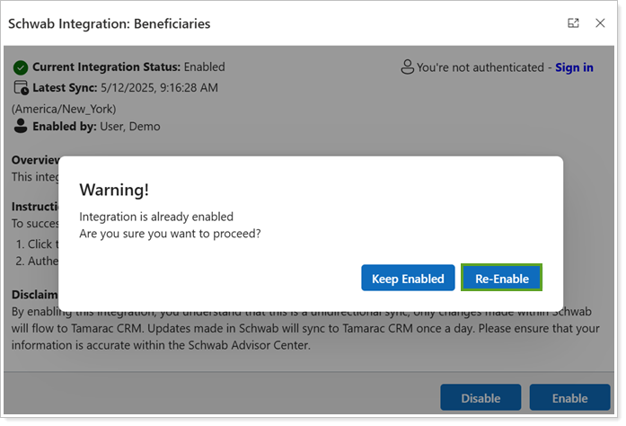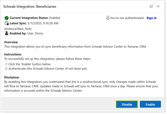 In Schwab Integration: Beneficiaries, select Disable.