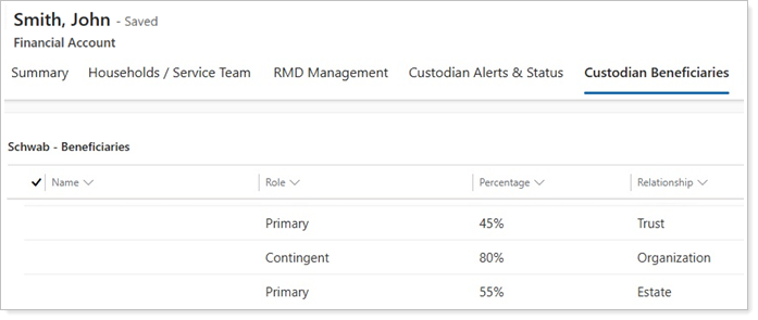 Once you enable the Schwab Beneficiaries integration, all eligible financial account records with beneficiary data in Schwab Advisor Center will sync under the Custodian Beneficiaries tab on the record.