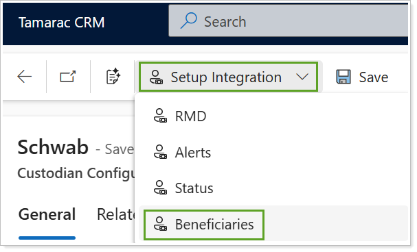 Under Setup Integration on the command bar, select Beneficiaries. The Schwab integration must be enabled to complete the Beneficiaries integration setup.