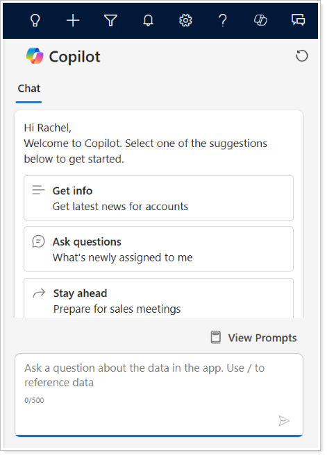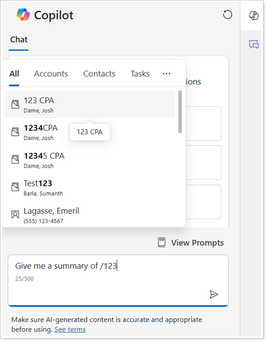 Be specific with your queries. Copilot operates more effectively with prompts that cover specific topics or isolate an entity or record. To query answers for a specific entity or record, enter / before the number or name to search and select from the list.