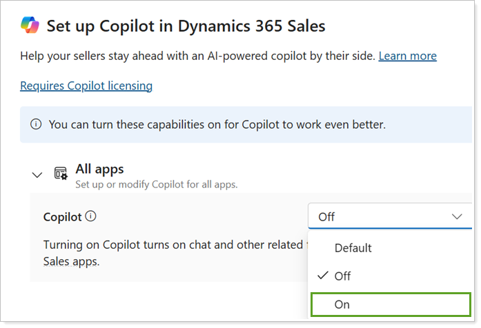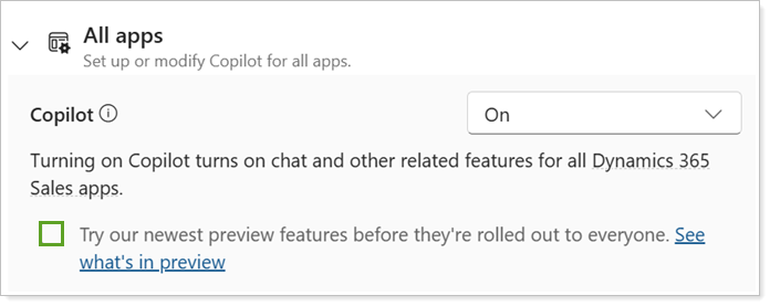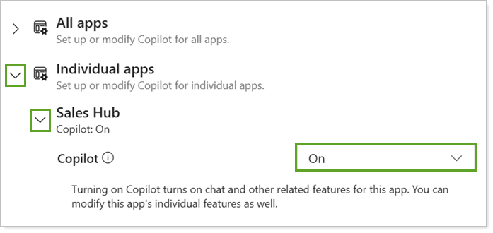 If you want to enable Copilot only for the Sales Hub app, under All apps, select Off. Under Individual Apps and Sales Hub, select On.