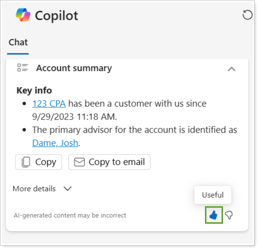Verify accuracy. While Copilot is a powerful assistant, it can make mistakes. Always review its insights and confirm the data based on your expertise and knowledge of your clients.