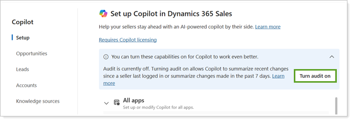 If you configure Copilot with additional tables, turning on audit history will apply to those tables as well. If you remove a table in the future, you must manually turn off audit history.