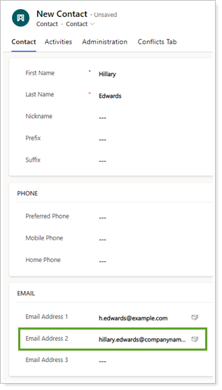 If a husband and wife share an email address, best practice is to add the email address on the primary contact only. For instance if the husband is the primary contact, you would add the shared email address to his contact and not to his wife. If an email address is used twice in CRM, it can result in tracking errors, including email not tracking automatically. This includes anywhere that an email address can be added for individual contacts, leads, and users.