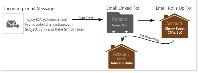 Track in Tamarac CRM automatically files the email address under the Bob Jones contact, and it rolls up to Cherry Street CPAs, LLC, the account associated with Bob's contact record.