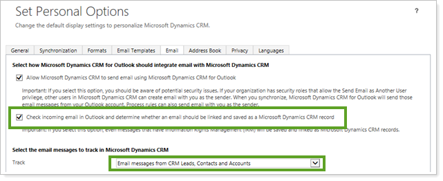 Under Email tab in Set Personal Options, you should see the second box checked next to “Check incoming e-mail in Outlook…” Under this option, you should also have Account, Contact, and Lead selected in the drop down menu listed below.