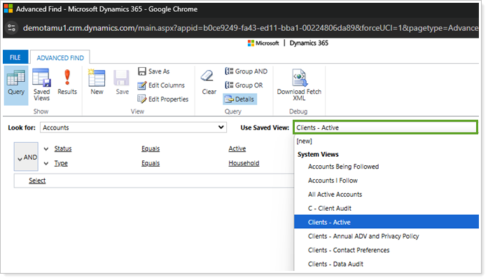 To more efficiently access these custom searches and insights on a daily basis, you can create custom views from Advanced Find to readily view in Tamarac CRM and share it with members of your organization.