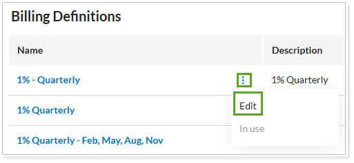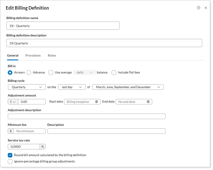 We recommend that you give each billing definition a descriptive name that makes it easy to understand later. For example, a basic quarterly definition with a tiered structure starting at a rate of 1% might be called Quarterly 1%.