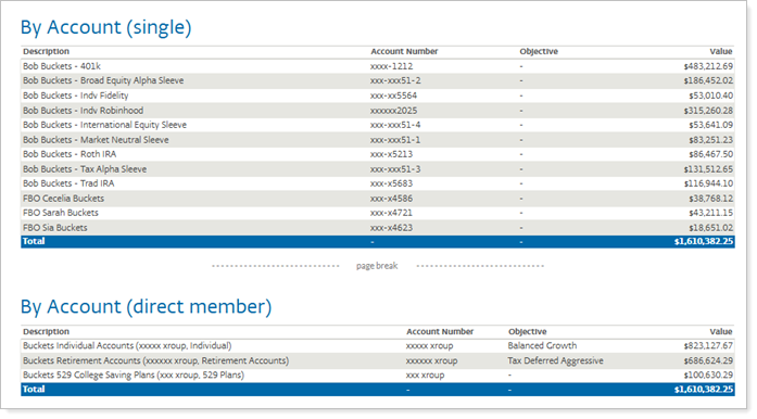 We understand how valuable the ability to group assets is to how you present reports to your client. With this release, you can organize your account data in the following ways: