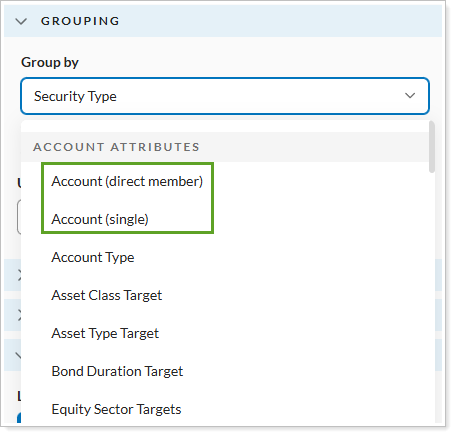 In previous versions of Report Studio, grouping by account meant different things depending on the type of report. For example, the Asset Allocation report grouped information by each account member, but the Account Performance report grouped it by direct members. This difference only mattered for reports with groups that included direct member groups. With the latest update, you get better grouping options that make it easier to organize your reports the way you want.