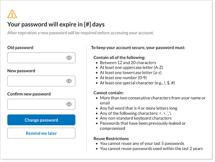 With this release, passwords will expire on a firm‑defined schedule of up to 180 days, with clear, predictable notifications leading up to the expiration date. Starting 10 days before expiration, you'll see a once‑per‑day reminder at sign-in prompting you to reset their password or defer for a day.