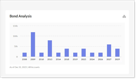 The widget also lets you set an as-of-date and integrates with the reporting platform to show your selected security types, accounts, and dates. Use the dropdown menu to filter bond maturities by account. The widget is fully responsive and displays consistently on any supported device.