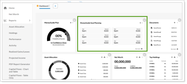Clients can add the widget to pre-built dashboards or include it on their own dashboards. The widget displays up to six upcoming goals useing data pulled from MoneyGuide, including: