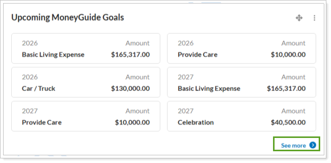 To view more details, you can select the link in the widget to open the MoneyGuide Goal Planning page. Selecting See more displays additional goals beyond the initial list.