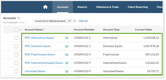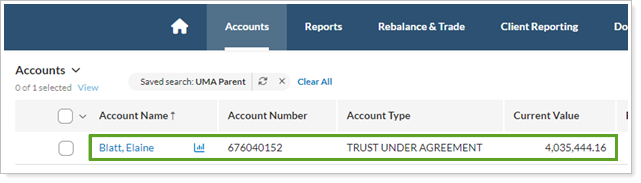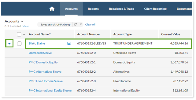 On the Accounts page, the above saved search returns the prebuilt group of UMA sleeves that make up the UMA. You can expand the row to see the sleeve list. The UMA Parent account is excluded from the list.