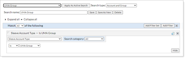For TUMA, Tamarac automatically builds a UMA Group of all sleeve accounts for each UMA Parent. To find your UMA sleeve accounts and show them with their group, you can add a filter where the Search type is Account and Group and the Sleeve Account Type is UMA Group.