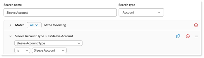 To find and report on only your UMA sleeve accounts, you can add a filter where the Search type is Account and the Sleeve Account Type is Sleeve Account.