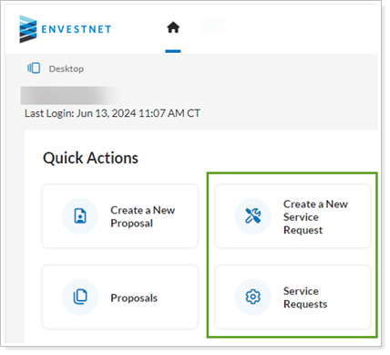 From Envestnet: To access Envestnet Service Requests when you're already on the Envestnet platform, select one of the Service Request options from your Envestnet Desktop.