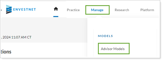 To build and maintain UMA models, from your Envestnet Desktop, select Manage, then select Advisor Models.