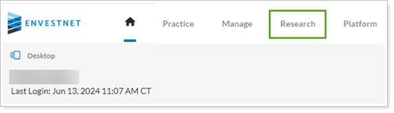 To access the Research Center, from your Envestnet Desktop, select Research.