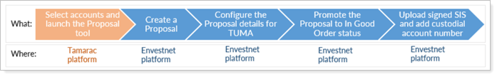 Set up the Proposal with the specific configuration to create Tamarac Unified Managed Accounts. You must complete each step in the Proposal tool to initialize the TUMA accounts and to generate the Statement of Investment Selection (SIS) on Envestnet. |
