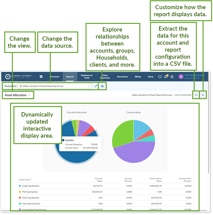 Interactive dynamic reports are fully configurable reports that allow advisors and firm users like you to evaluate characteristics of a financial account, reporting group, account set, or, depending on the report, Household. Reports allow you to explore patterns, answer questions about trends or anomalies, and ask related questions about account data for holdings, transactions, performance, trading, and more.