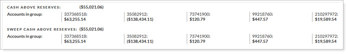 The excess amount of cash an account has available in an account, including sweep money market cash, calculated as (Total Sweep Cash – Cash Reserves – Cash Substitutes). |